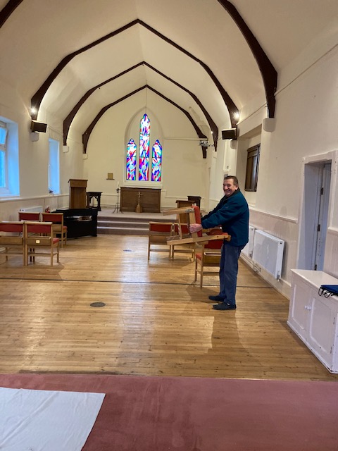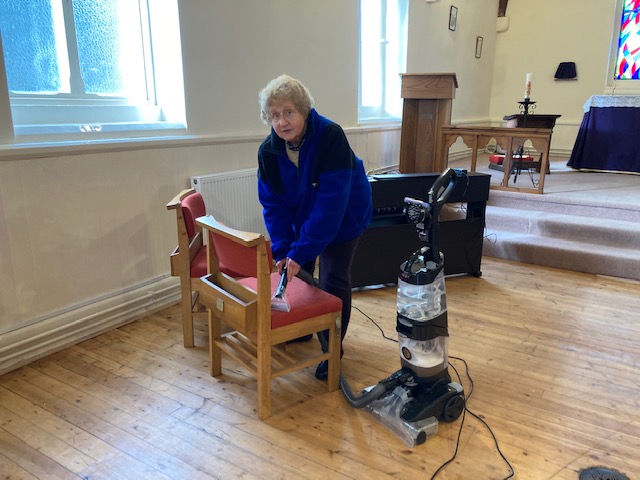 Joyce continued to clean and tidy up and Rita shampooed the chairs in the Nave